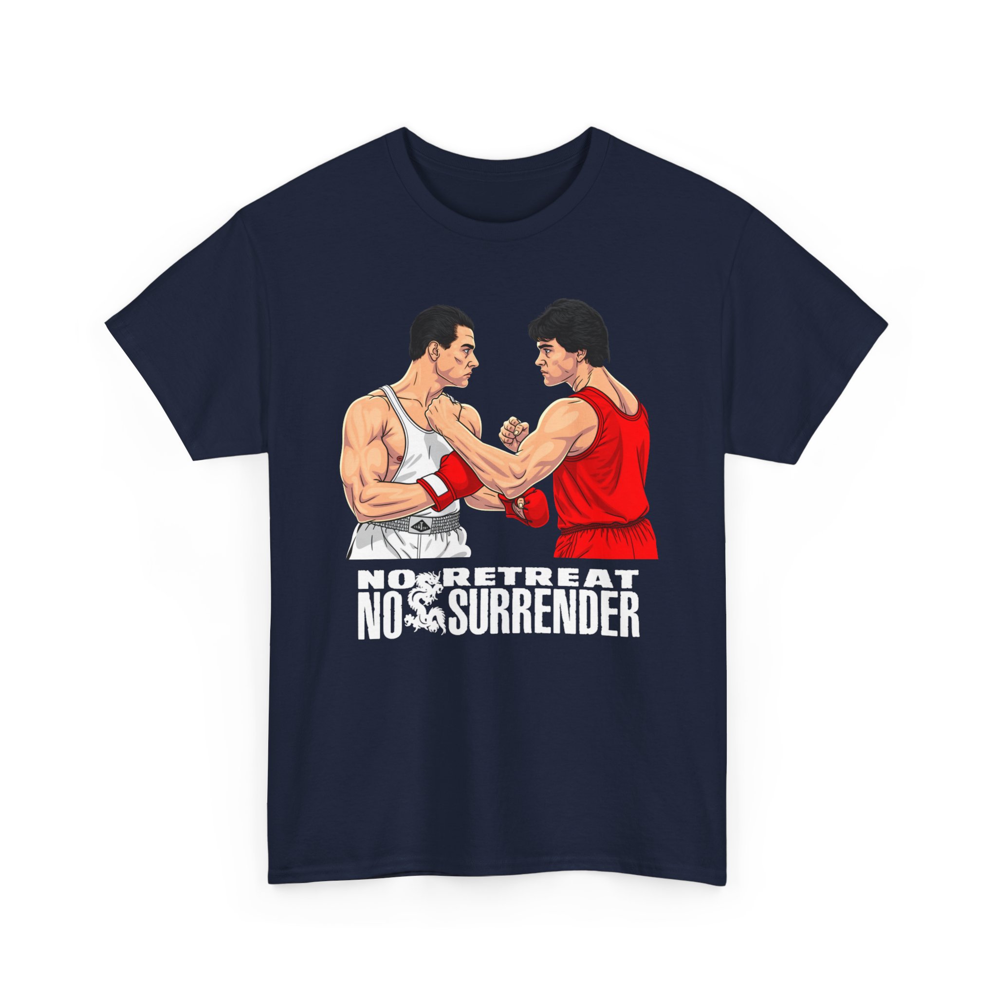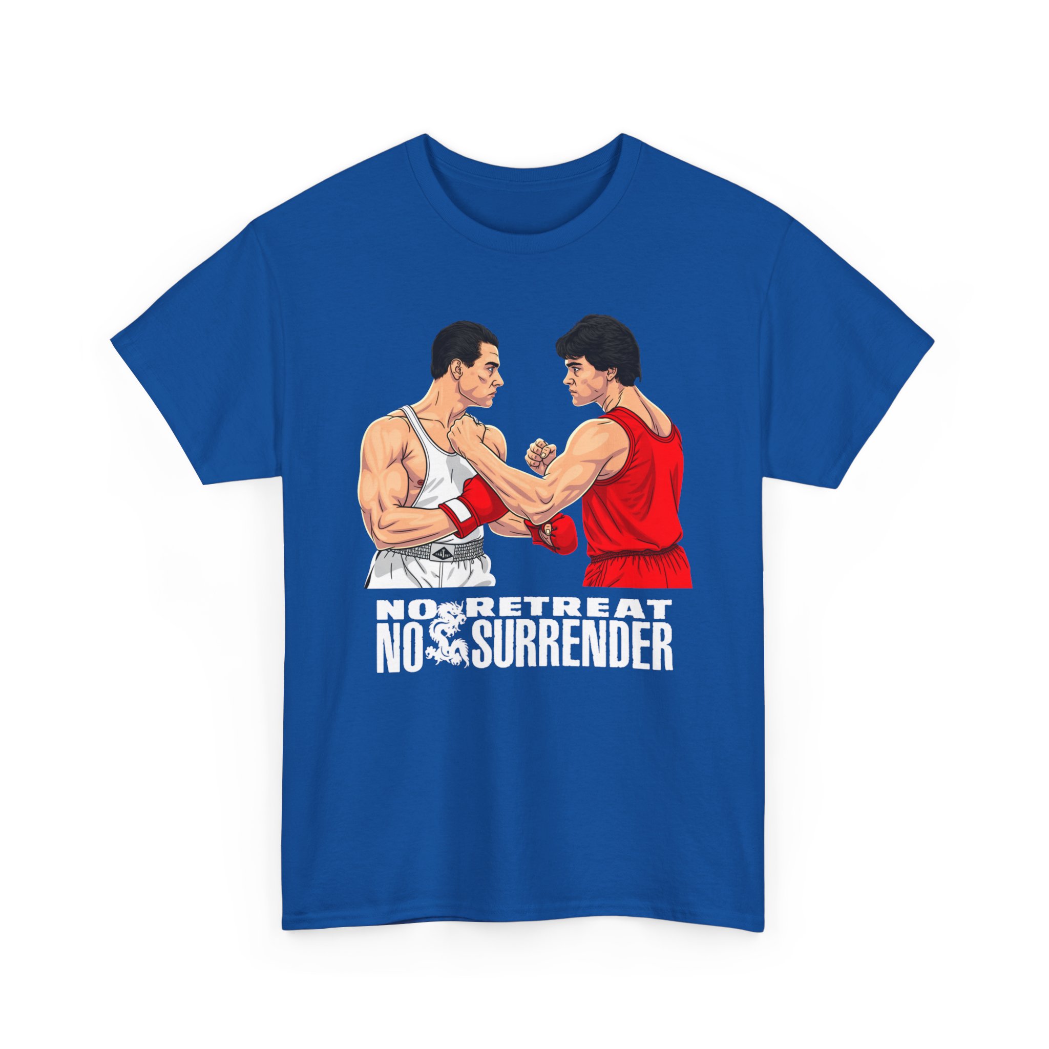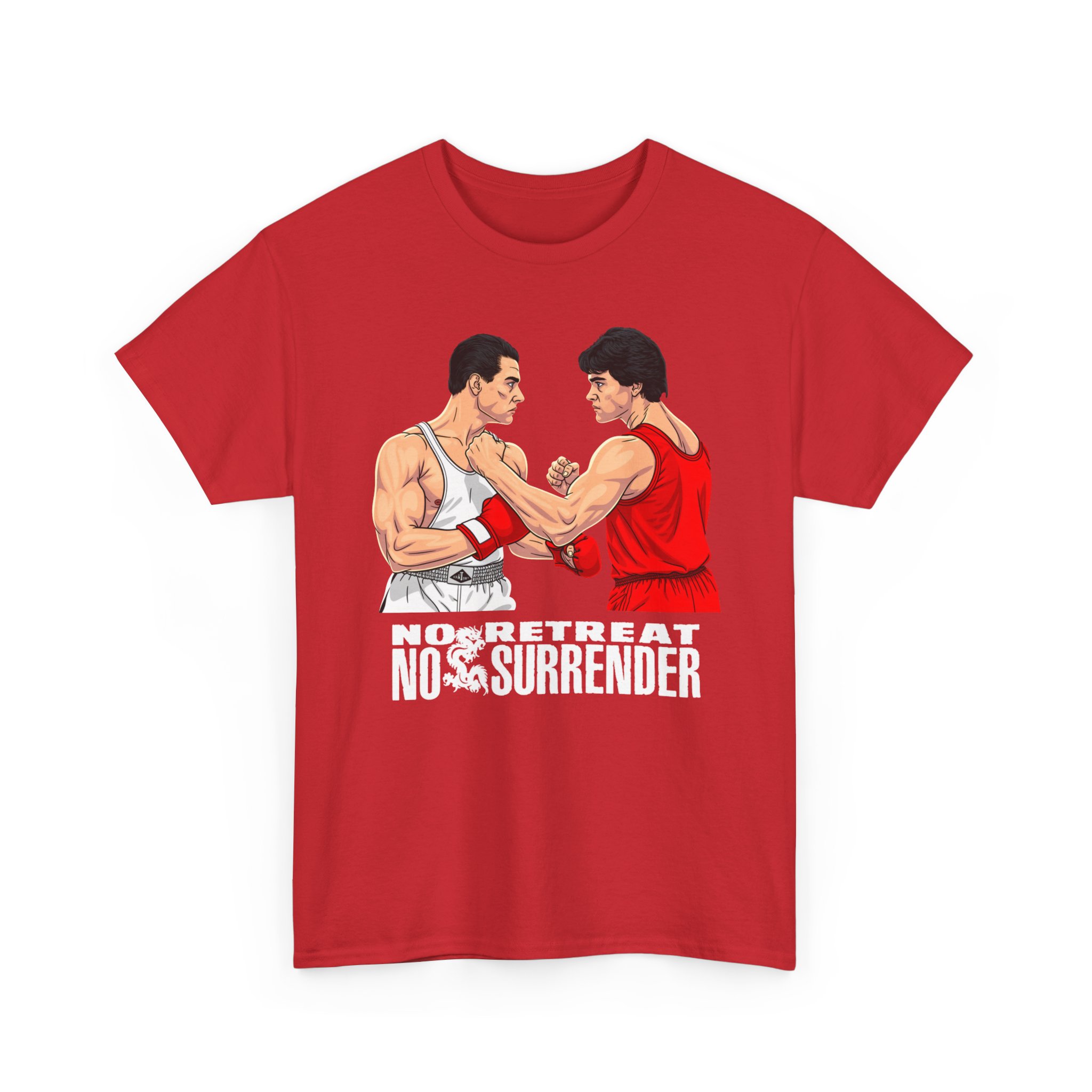 This heavyweight cotton tee channels old-school grit — the kind that shows up in boardroom bravado and late-night gym sessions. The bold “No Retreat No Surrender” theme and the clash-of-faces imagery evoke tense showdowns and borrowed movie-day adrenaline. Wear it when you want to feel steadier, louder, and more decisive: pull it on before a long drive to a midnight screening, while rewatching cult action films with friends, or when you need that extra pulse of confidence before stepping into a crowded room. The print’s high-contrast detail holds up wash after wash, and the classic crew-neck silhouette keeps the look grounded and wearable with denim, a leather jacket, or layered under a flannel. It’s for people who collect moments of cinematic intensity and like their everyday clothes to speak with that same directness.