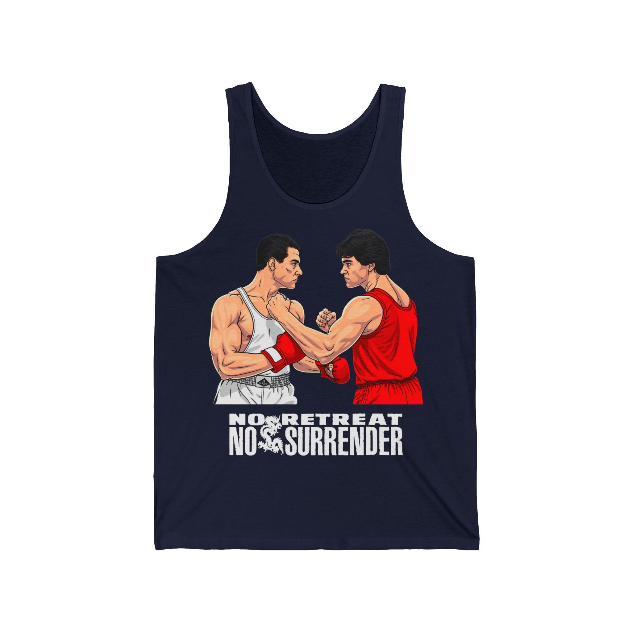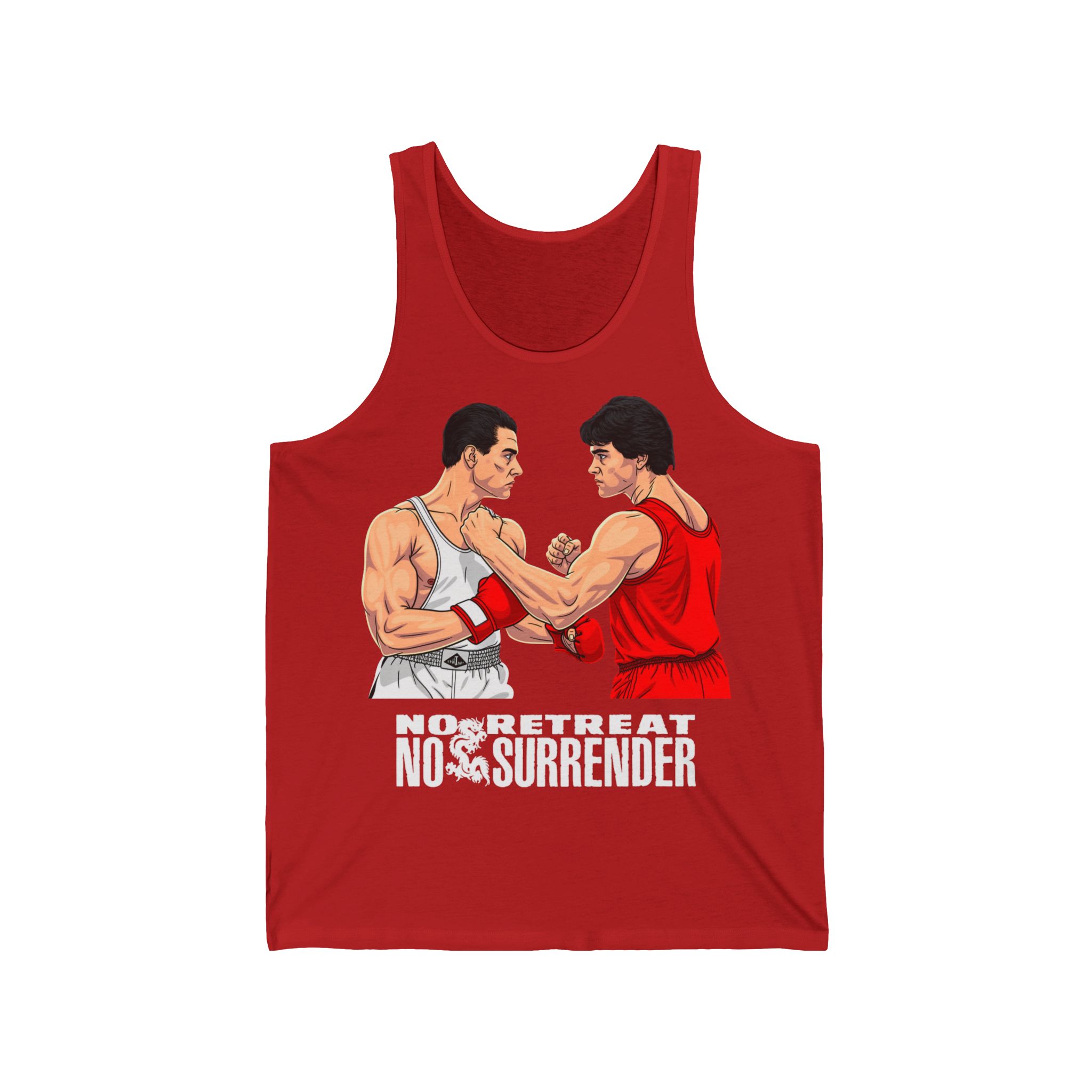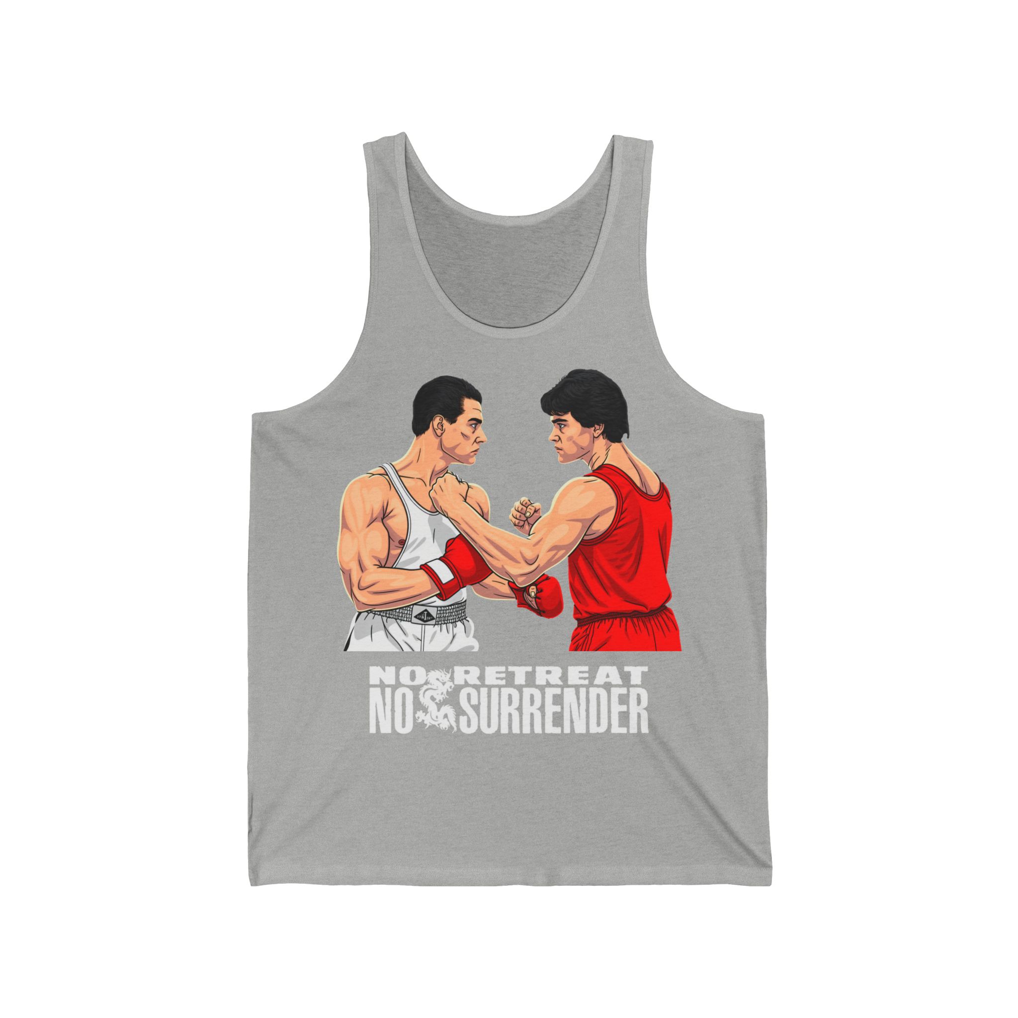This tank channels the raw energy of classic martial-arts cinema—think late-night showdowns, heated training halls, and the electric tension before a decisive kick. The design calls to mind Van Damme and Kurt McKinney squaring off in the classic ‘No Retreat No Surrender’ known in German as ‘Karate Tiger’, so wearing it feels like stepping into that cinematic fight-night atmosphere. Lightweight and breathable, the tank sits close to the body without restricting movement, making it right for training sessions, layered streetwear, or lazy afternoons rewatching fight sequences. The subtle nod to a cult action moment sparks conversation among fellow film buffs and martial-arts heads, and the retail fit keeps the silhouette modern whether you’re throwing kicks or standing in line at a midnight screening.